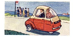Britain. The stubby Hunslet "SCOOTACAR" styled with two front wheels and single rear, seats two tandemwise. Powered by a 197 cc unit, it has a top speed in excess of 45 m.p.h. with low fuel consumption.
